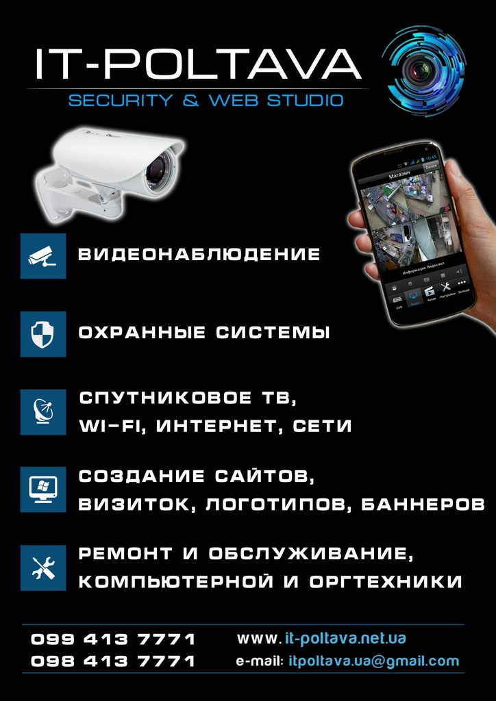 Наша компания занимается продажей, обслуживанием и установкой видеонаблюдения, охранных систем и спутниковое телевидение.